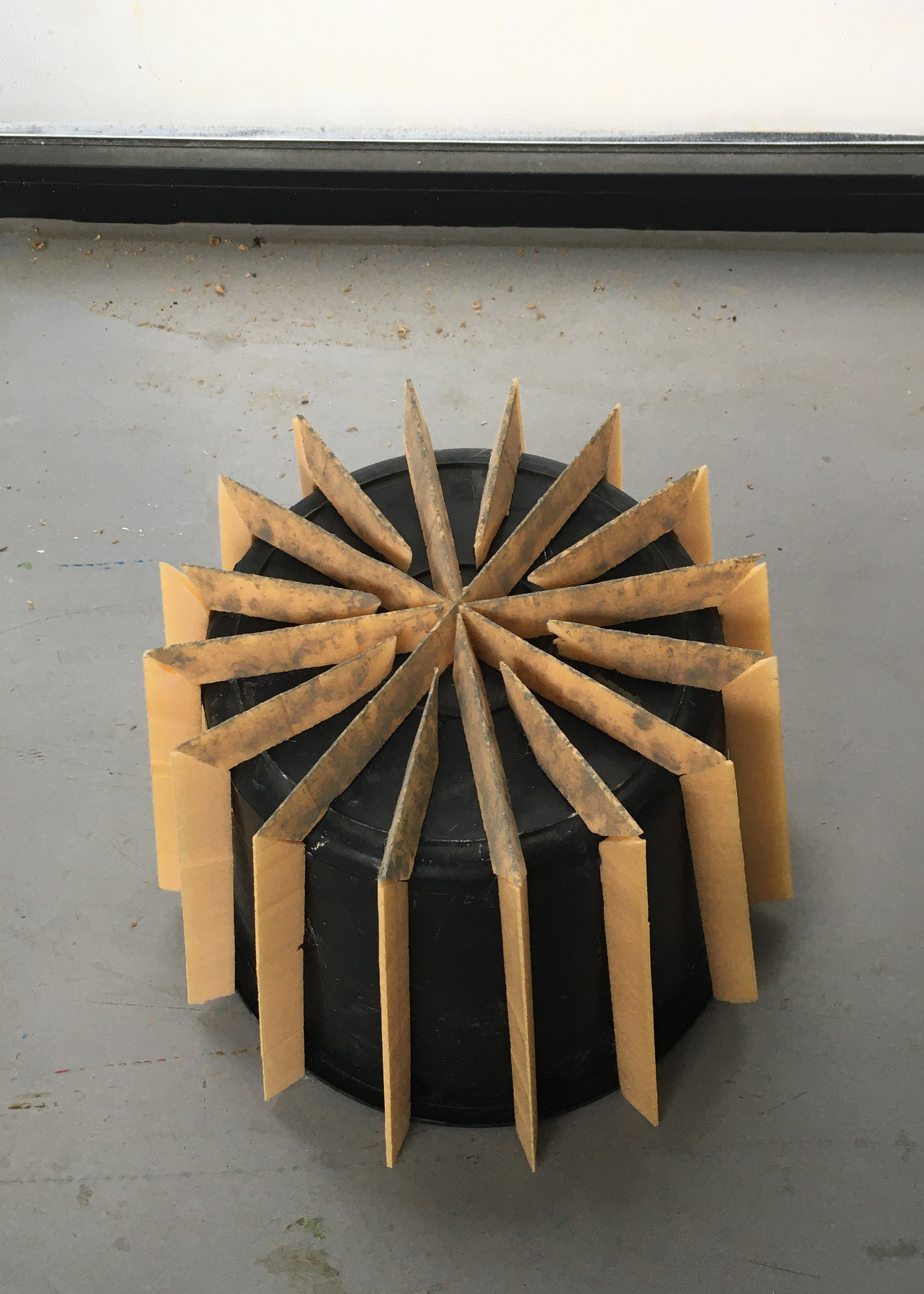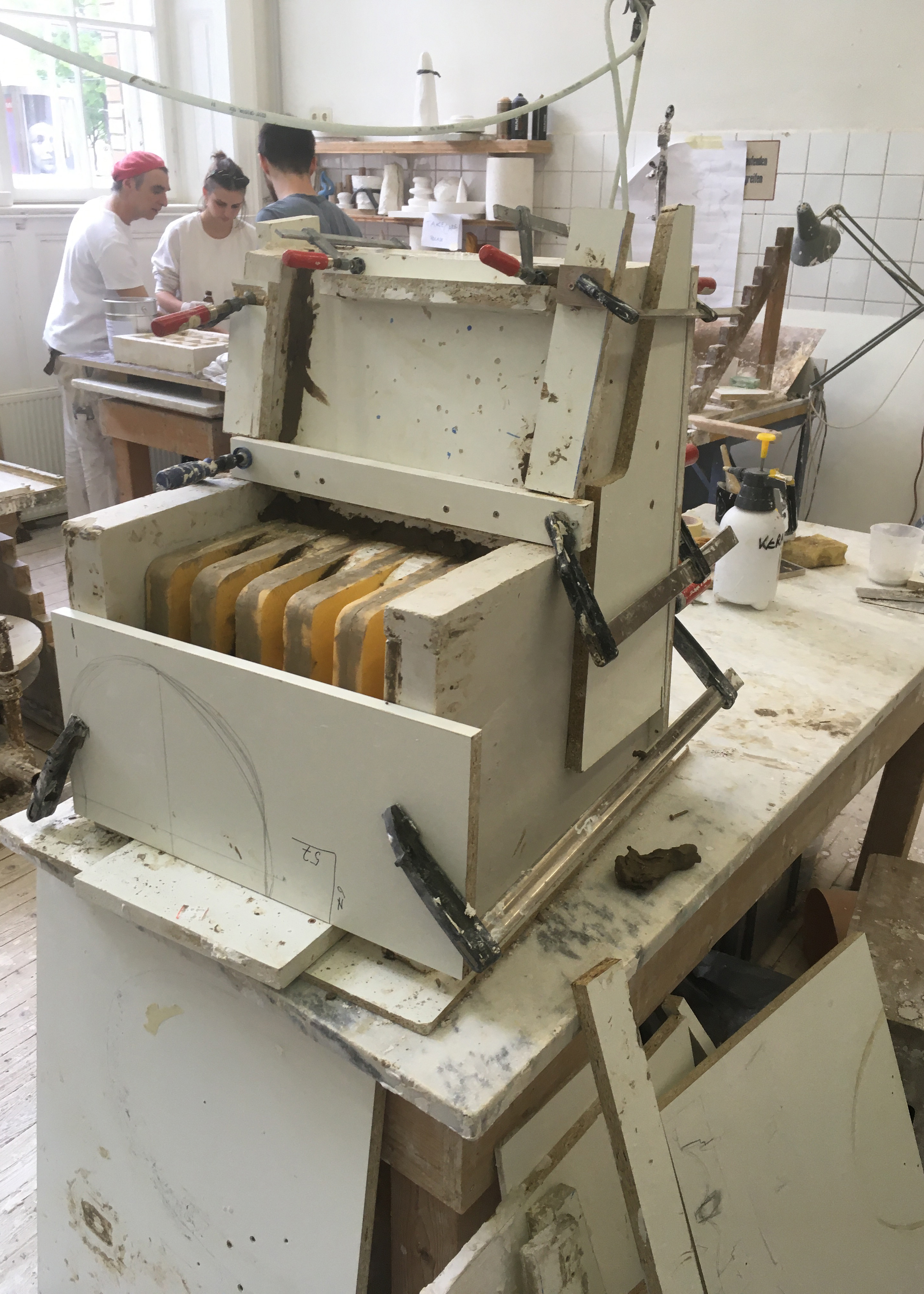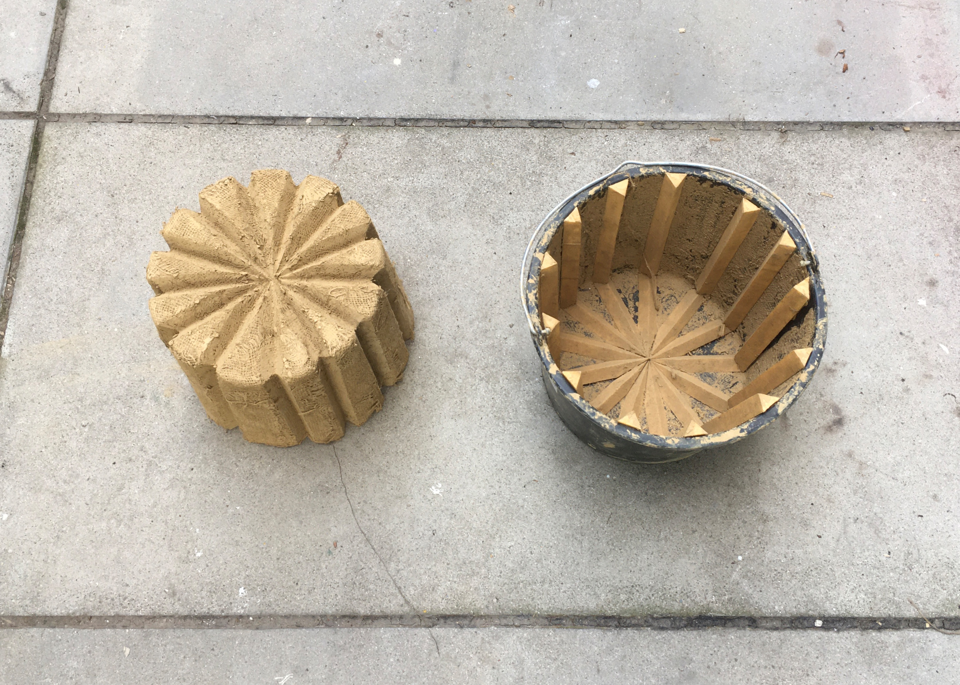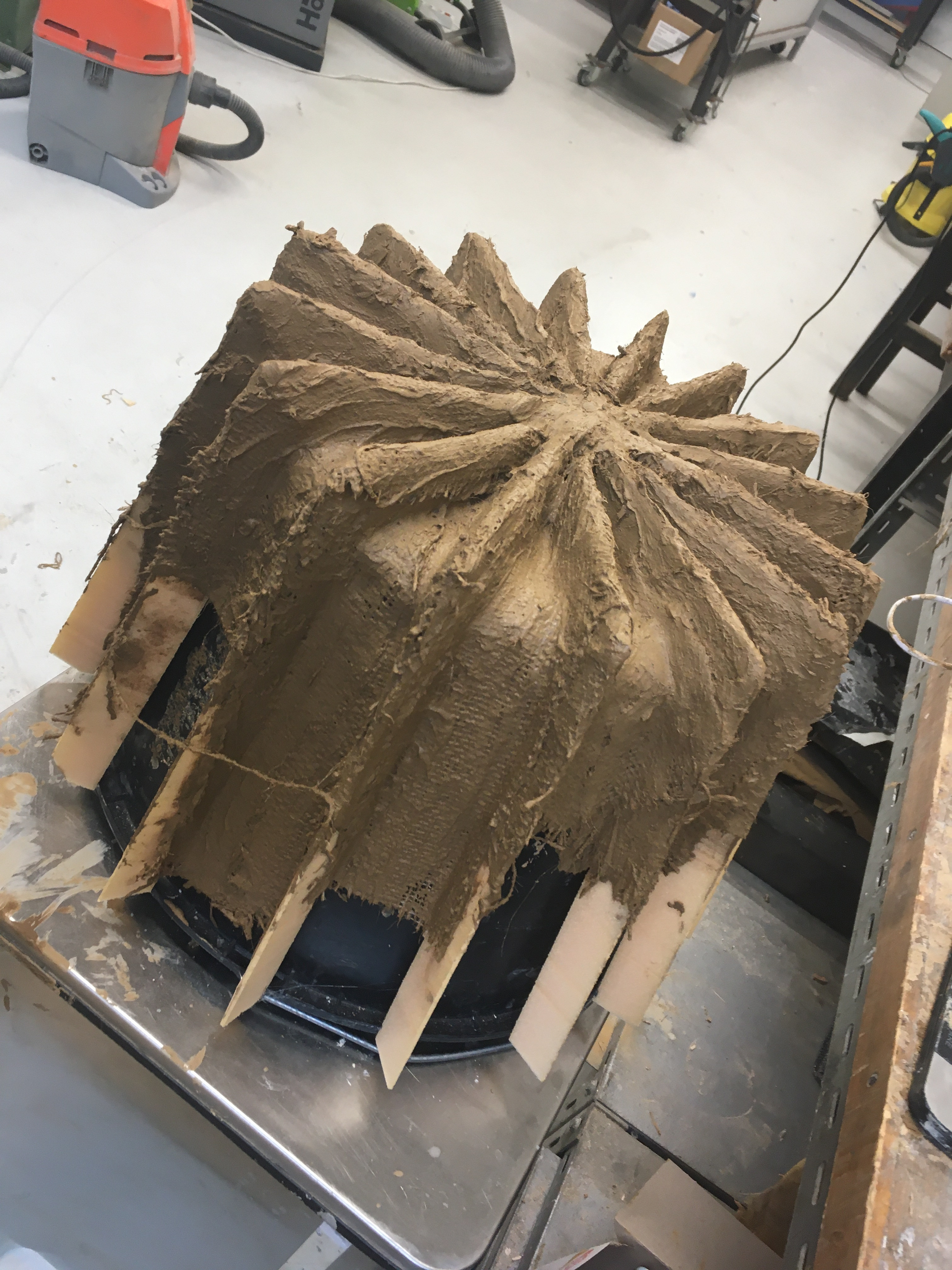 The formwork was produced in an interlocking layered structure consisting of coarse-meshed jute fabric, which acts as a reinforcement. On the one hand, the rough surface of the natural fiber absorbs a lot of clay, on the other hand, the single layers of fabric interlock better during shrinkage in the drying process and connect to a heterogeneous material.
